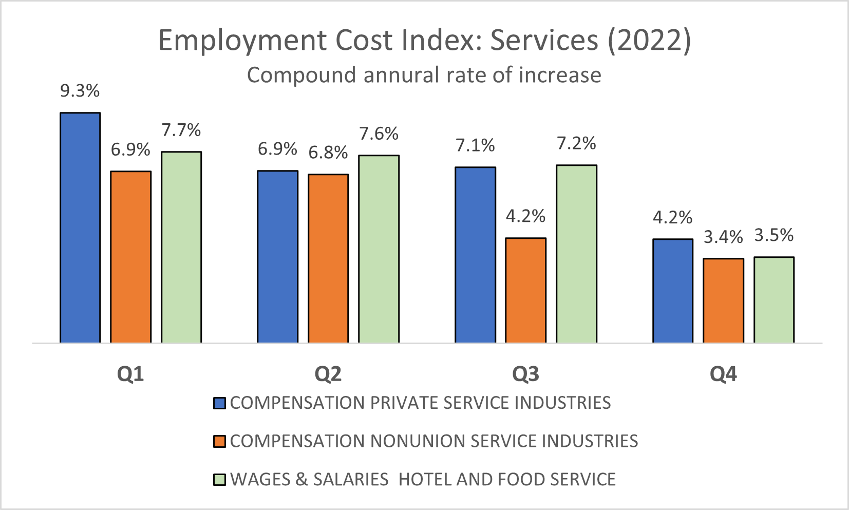 The graph shows the fourth quarters’ annual rate of compensation growth for services was the same as for the private sector a whole (4.2%), and a little slower (3.5%) for nonunion services. Only wage and salary figures are available for accommodations and food service industries, but they too rose at a 3.4% pace.