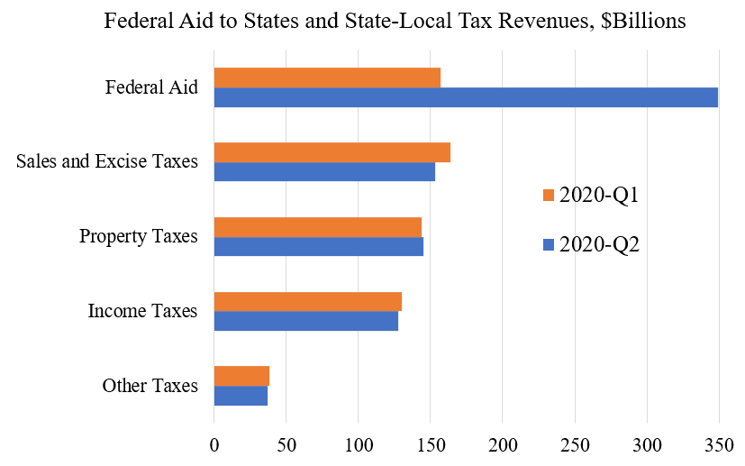 While tax revenues have dipped slightly, federal aid to state-local governments has soared. Total tax revenues fell $13 billion from the first to the second quarter. But federal aid rose $192 billion as cash from federal relief bills filled state-local coffers. Total state-local revenues (from federal aid, taxes, and other sources) rose from $716 billion in the first quarter to $893 billion in the second quarter.