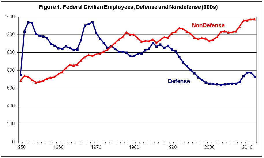 Figure 1: Splits total federal civilian (non-uniformed) employment into defense and nondefense. For nondefense, you can see the modest retrenchments under Reagan and Clinton, and you can see the expansions under Bush 1, Bush 2, and Obama.
