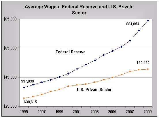In 2009, total average wages and benefits of Fed Bank workers was $124,974, or more than double the $61,051 average compensation in the U.S. private sector. Fed workers have very generous benefits, including rare perks such as subsidized cafeteria meals.