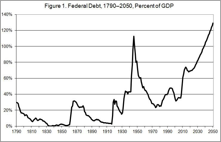 Figure 1, below the jump, shows federal debt held by the public as a share of GDP from 1790 to 2050. The data for past years are from CBO analyses here and here. The projection is CBO’s new extended baseline.