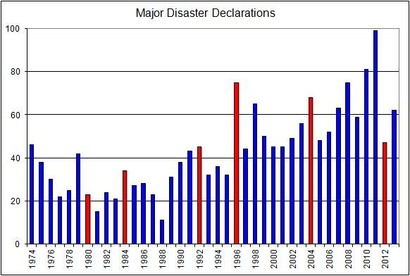 In the chart, I marked with red bars the years that presidents ran for reelection. In those years, presidents have generally declared the most major disasters. That was true of Ronald Reagan in 1984, George H.W. Bush in 1992, and Bill Clinton in 1996. George W. Bush declared the most disasters of his first term in his reelection year of 2004. The two presidents who do not fit the pattern are Jimmy Carter and Barack Obama.