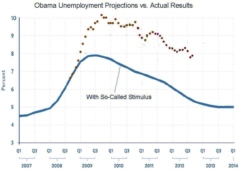As you can see, the joblessness rate currently is more than 2.5 percentage points higher than Obama claimed it would be if we implemented his Keynesian plan.