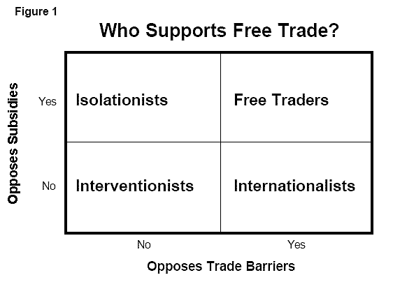 Each member’s record is plotted on a two dimensional graph that distinguishes between trade barriers and trade subsidies. Many representatives and senators vote against trade barriers but in favor of trade-distorting or protectionist subsidies. We call these folks Internationalists. Those who vote against subsidies but favor barriers are labeled Isolationists. Supporting both barriers and subsidies will place you in the Interventionist category, while consistent opposition to both sends you toward the venerable Free Trader designation.
