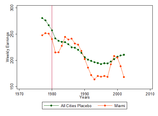 That such dramatically different findings can result from such minor changes in methodology weakens all of the research on this topic – including mine. Reading the work by Card, Peri and Yasenov, Borjas, and Borjas and Monras, and then conducting my own replication and extension of their results has significantly weakened my confidence in any of these findings. For instance, weekly earnings for Hispanic dropouts between the ages of 25 and 59 increased in Miami shortly after the Boatlift (Figure 1). Hispanic dropouts should be the most substitutable for Marielitos but they’re not according to Borjas’ methods. This graph would well fit into David Card’s research.