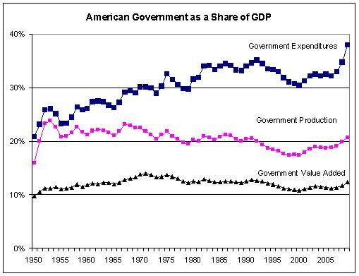 A more commonly cited measure of government is total government spending. In 2009, that was 38 percent of GDP. The difference between this number (38 percent) and the production number (20.7 percent) is 17.3 percent, and represents the sum of government interest payments and transfer payments to individuals and businesses.