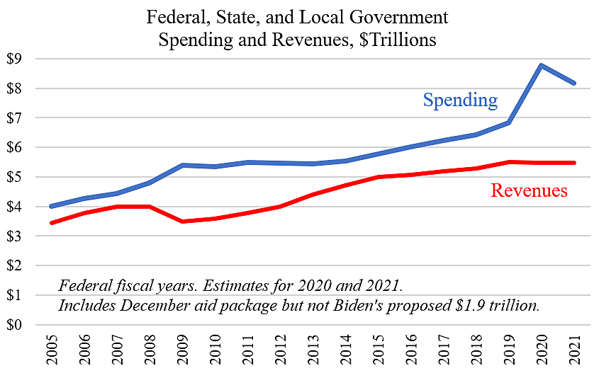 The data for 2005 to 2019 are from Table 14.1 and 14.2 here. Federal spending and revenues for 2020 are here. For 2021 federal spending, I assumed CBO’s baseline plus $875 billion from the December aid bill. For federal revenues, I assumed 2021 will be the same as 2020. State and local spending and revenues for 2020 are calculated from BEA quarterly data in Table 3.3 here, and 2021 is assumed to be the same.