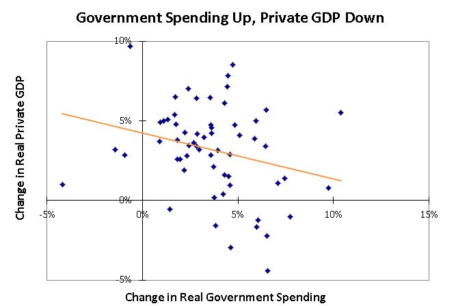 Note that my explanatory variable was total government spending, which includes government production and government transfers. I think that both types of government spending harm the private economy. If the government increases UI payments or food stamps, for example, it induces fewer people to work.
