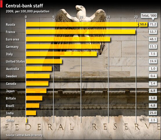 The picture below, taken from a story in The Economist, shows that France, Germany, and Italy are among the nations with the most central bank employees (as a share of the population). In some sense, this is a dog-bites-man factoid. After all, is anyone surprised that Europe’s major welfare states have bloated public payrolls? But there’s more to this story. All three of these central banks ceased to have a monetary policy, starting back in 2002, when their nations adopted the euro. The mission is gone, but the bureaucracy lives on.