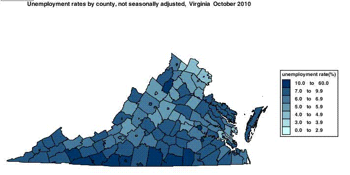 A map of Virginia’s unemployment rate by county produced by the Bureau of Labor Statistics is illustrative: