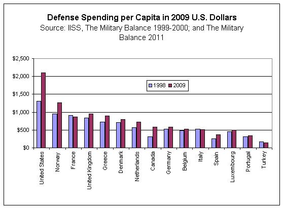 A little over a year ago, I posted two different graphs (with the help of my colleague Charles Zakaib) that showed the growth of U.S. national security spending vs. that of other NATO allies over the last ten years. The data, based on the International Institute for Strategic Studies’ annual Military Balance, showed that U.S. taxpayers spend far more on our military, both as a share of total economic output, and on a per capita basis, than do any of our allies.