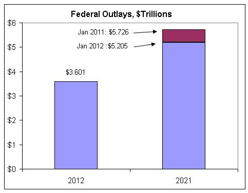 Let’s compare the new CBO budget projections to CBO’s January 2011 projections. The new 10-year projections do look a little better, at least by Washington standards. A year ago, CBO’s baseline showed the deficit falling modestly from more than $1 trillion this year to $763 billion by 2021. CBO’s new baseline shows the deficit falling to just $279 billion by 2021.
