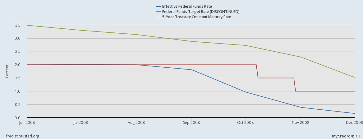 Far from having endeavored, back then, to lower interest rates, Fed officials feared that, as rates approached their “zero lower bound,” monetary policy would cease to be effective. Although it’s true that during October 2008 the FOMC lowered its federal funds rate target, first from 2 percent (where it had been since the end of April) to 1.5 percent, and finally to 1 percent, it made these changes reluctantly, and did so in each case after the effective funds rate (the median value of actual overnight loan rates) fell well below the targets already in place. Longer-term interest rates likewise fell in advance of the Fed’s target changes, as can be seen from the chart below, which compares the Fed’s funds-rate target to both the effective federal funds rate and the yield on 5‑year Treasury Notes. In few words, by the time the Fed got around to lowering it, the federal funds target had ceased to have any meaning, save as a symbol of Fed officials’ vain hopes.