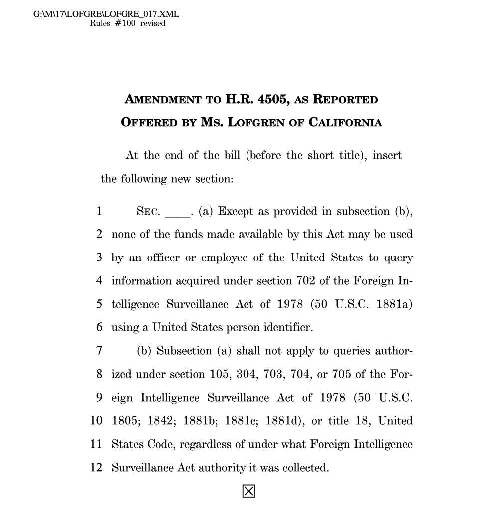 The amendment itself is similar to ones offered in past Congresses by Lofgren and Massie as a short-term, but real, means of preventing the FBI and other federal agencies from conducting digital “fishing expeditions” on the data of Americans swept up—deliberately or otherwise—under the infamous FISA Section 702 program. It should be noted that the FISA Court has never sanctioned any federal department or agency for documented violations of the rights of Americans in connection with the Section 702 program.