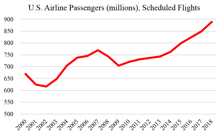 Millions of Americans will deal with the hassles of air travel this week as they join their families for Thanksgiving. Airports are crowded, flights get delayed, and travelers get stuck in long security lines. Things may get worse as aviation demand rises and puts even more strain on the system. The chart below shows total annual U.S. airline passengers on scheduled flights.