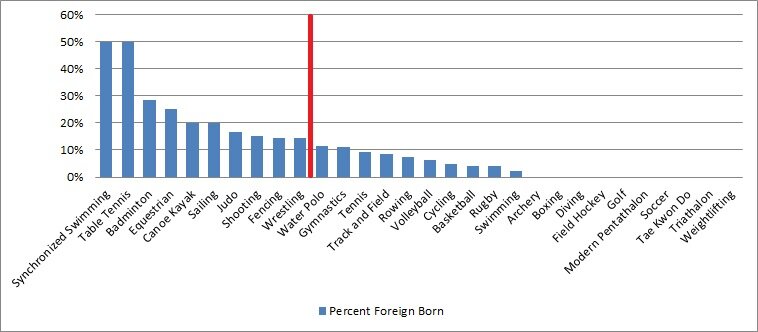 Many noticed the refugee team competing in the 2016 Rio Olympics but few noticed the immigrants on the American team. As far as I can tell, 47 out of the 554 American athletes were born in another country although some of them are probably the children of American citizens born abroad. Thus, 8.5 percent of American Olympians were born in another country. However, immigrants are underrepresented among Olympians because 13.3 percent of the U.S. population is foreign-born. Despite being underrepresented as a whole, immigrants are more likely to be in some sports rather than others.