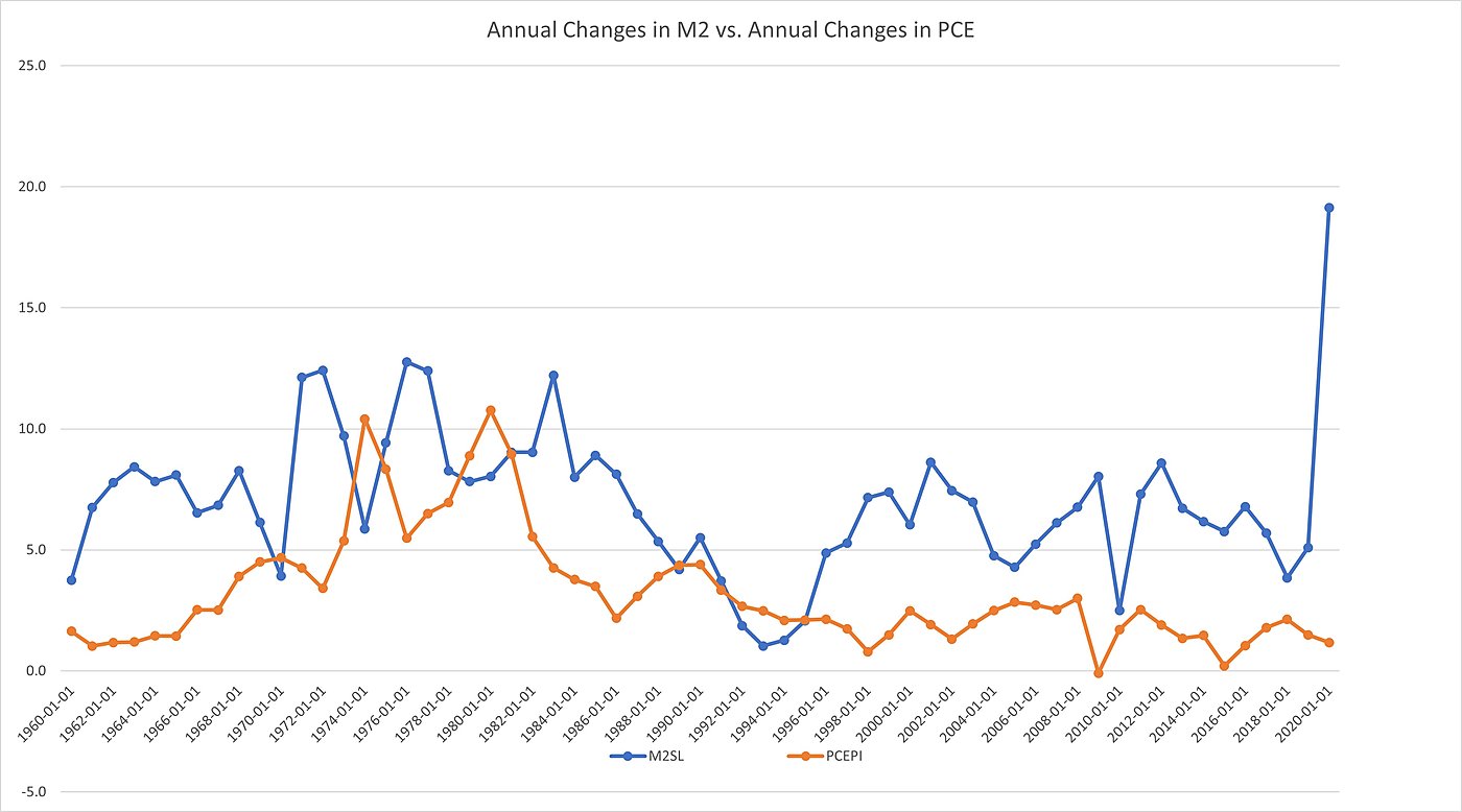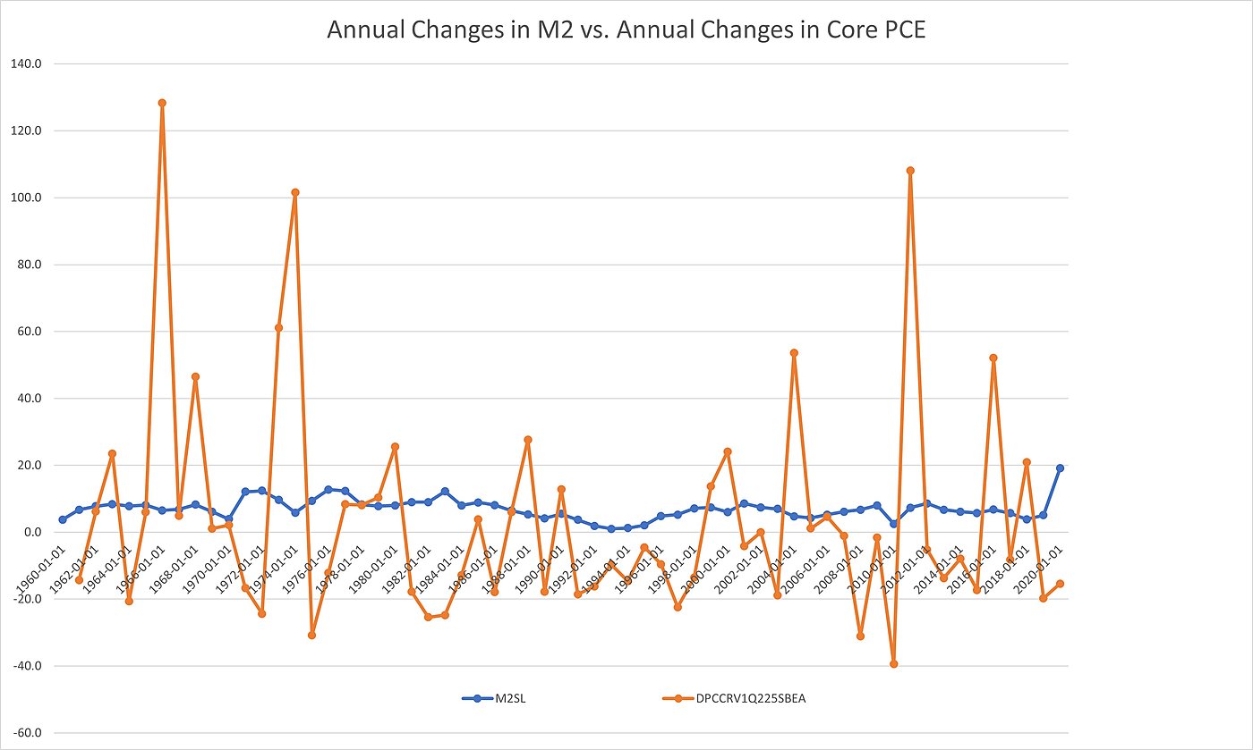 - Although there is a natural (sometimes justified) tendency to associate inflation with “printing” additional money, the historical relationship between annual changes in money and inflation (using the M2 aggregate measure for money and the overall PCE index for inflation) shows that inflation has been low and stable for decades even following large increases in money. In fact, dating to 1960, annual changes in the core PCE display very little correlation with M2 growth. (See Figure 2 and Figure 3.)