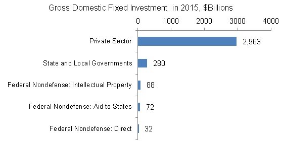 The figure below shows data from BEA tables 1.5.5 and 5.9.5 on gross investment in 2015. The first thing to note is that private investment at about $3 trillion was six times larger than combined federal, state, and local government nondefense investment of $472 billion. Private investment in pipelines, broadband, refineries, factories, cell towers, and other items greatly exceeds government investment in schools, highways, prisons, and the like.
