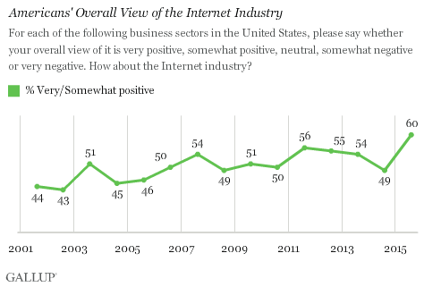 New polling from Gallup finds that more Americans view the internet industry favorably than any time since Gallup began asking the question in 2001. Today, 60% of Americans have either a “very positive” or “somewhat positive” view of the industry, compared to 49% in 2014.