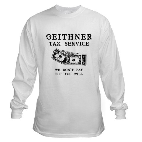 This is the last week to buy presents, so for those of you who can’t find zhu zhu pets, here are a couple of options sure to bring a smile. The first option is a long-sleeved t‑shirt honoring the Secretary of the Treasury.