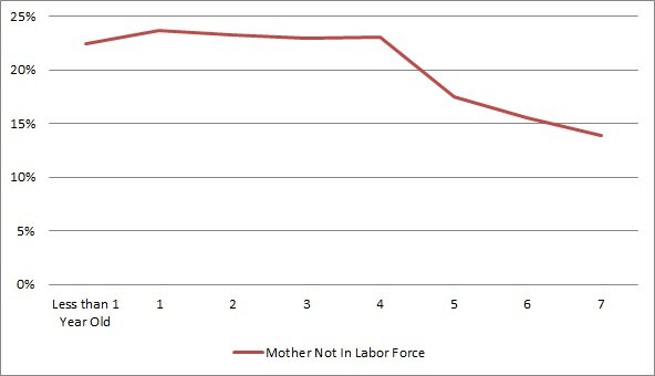 As the youngest child ages, the percentage of women not in the labor force also shrinks, probably because less labor at home is required to take care of them (Figure 1). Cheaper childcare provided by low-skilled immigrants can increase the rate at which these skilled female American workers return to the job after having a child.