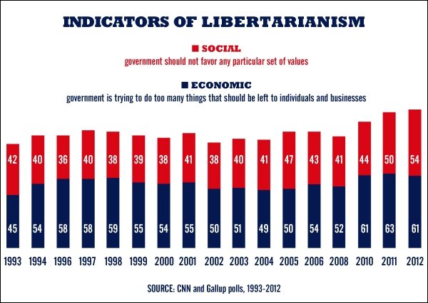 Last year Nate Silver of the New York Times wrote about rising libertarian trends on two questions regularly asked in CNN and Gallup polls: