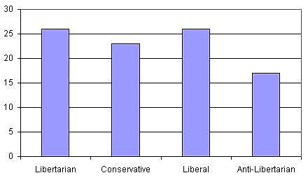 I asked Post polling director Jon Cohen if it was possible to get crosstabs for those questions, and he generously supplied them. So we can use those two questions to construct a four-way ideological matrix. I categorize the responses this way: Roughly speaking, libertarians support smaller government and civil unions. Conservatives support smaller government and oppose civil unions. Liberals support larger government and civil unions. And the fourth group–variously called statists, populists, or maybe just anti-libertarians–support larger government and oppose civil unions. And thus we find that on these two questions 26 percent of the respondents are libertarians, 26 percent liberals, 23 percent conservatives, and 17 percent anti-libertarians: