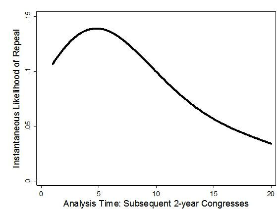 His post does shed light on the likelihood of repealing the individual mandate, however. As the below graph shows, the probability of repealing any provision of major legislation rises in each of the next five Congresses (i.e., over the subsequent 10 years). After that point, the probability of repeal begins to fall.