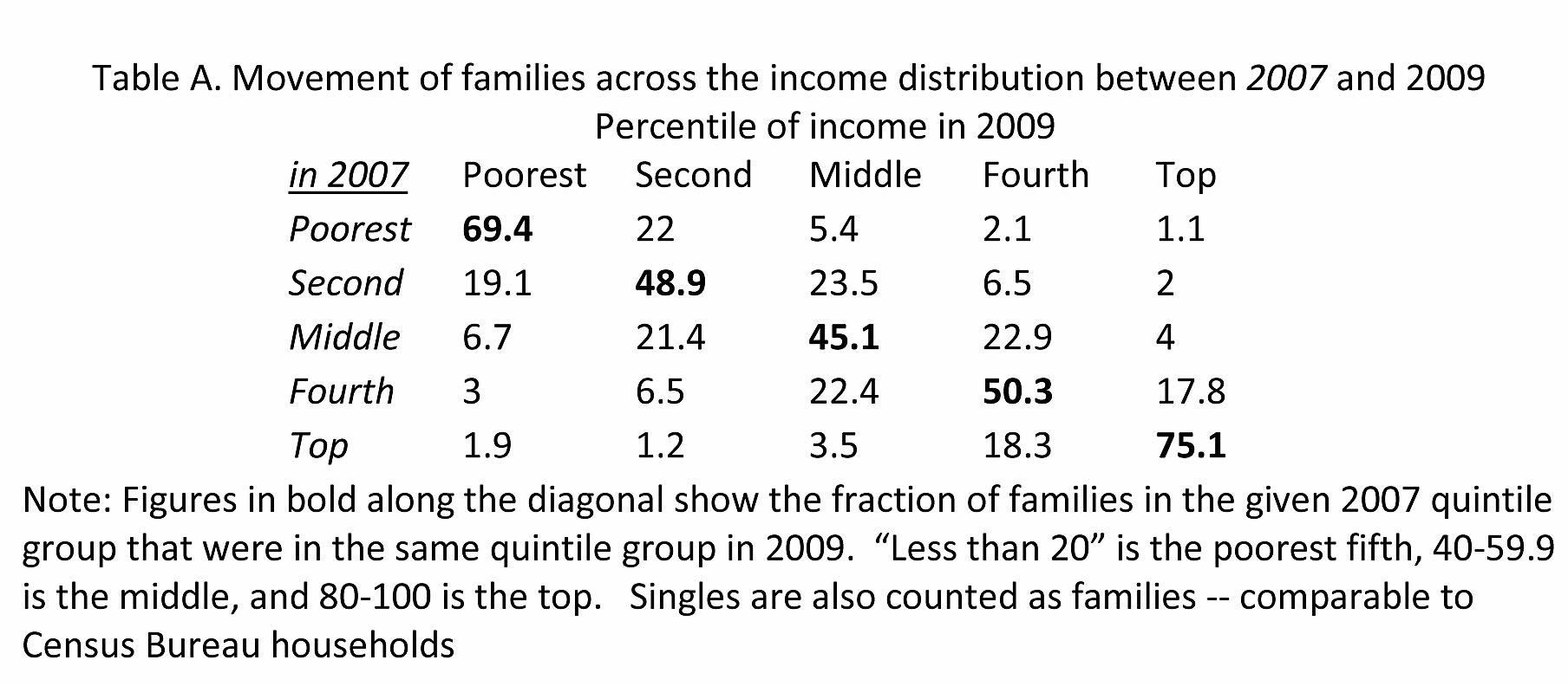 Table A, adapted from the latest SCF report shows changes in income by quintile (fifth) between 2007 and 2009. For example, only 45.1 percent of families with incomes in the middle fifth of the distribution in 2009 were also in the middle in 2007 (indicated by the bold font along the diagonal). Among the rest, slightly more moved up from a lower income group (28.9 percent) than slipped down from a higher group (25.9 percent).