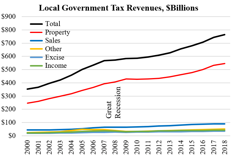 In fact, nationwide local tax revenues did not fall during the Great Recession, as BEA data from Table 3.21 shows in the chart. Property tax revenues—which account for about 72 percent of local tax revenues—remained robust. Revenues rose during the 2000s, flat-lined for a few years during the recession, then started growing again. Even though nationwide home prices dropped more than 20 percent from 2007 to 2011, local governments are slow to adjust valuations which smooths property tax revenues over time.