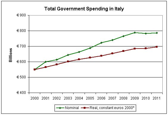 However, as is the case for Britain, France and Greece, commentators are unclear about what austerity means for Italy, although many seem to imply spending cuts. For example, if Krugman’s criticism about Italian austerity is consistent with his critiques about austerity elsewhere in Europe, we know he means spending cuts. So let’s take a look and see if there has been any: