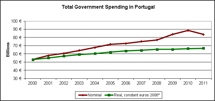 As a percentage of the size of the economy, total government spending in Portugal in 2011 stood at 45.2% of GDP, just a whisker down from its 2009 peak of 45.8%.