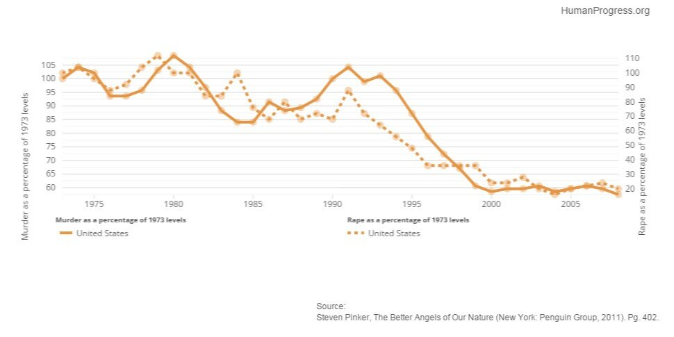 Harvard professor and HumanProgress.org advisory board member Steven Pinker provided a number of reasons for our deeply ingrained pessimism during a recent Cato event, “If Everything is Getting Better, Why Do We Remain So Pessimistic?” which can be viewed here. His book, The Better Angels of Our Nature, offers a more in-depth look at the decline of violence.