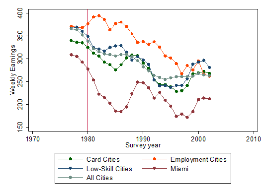 Harvard economist George Borjas recently published an important paper on how the unexpected surge of 125,000 Cubans (henceforth Marielitos) to Miami in 1980 lowered the wages of native-born male Miamians with less than a high-school degree. Because at least 60 percent of the Marielitos were high school dropouts, Borjas found that the negative wage effects were concentrated on Miamians with the same level of education.