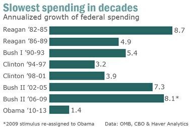 Here’s the chart he prepared, which certainly seems to indicate that Obama is a fiscal conservative. Not only that, it shows that Republicans generally are the big spenders, while Democrats are frugal with other people’s money.