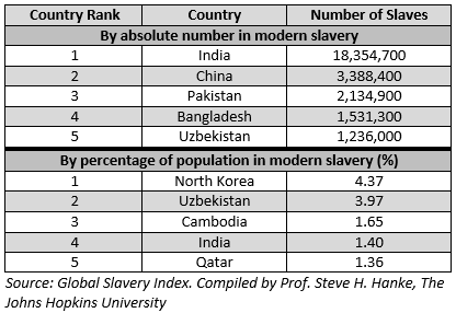 According to the Global Slavery Index, over 58 percent of slaves today live in just five countries. India’s embrace of slavery is astounding, with over 18 million Indians enslaved today – over 4.5 times more than the U.S. had during its peak decade of the 1860s.1 China, Pakistan, Bangladesh, and Uzbekistan round out the top five offenders. Seventeen countries have at least one percent of their populations living in modern slavery, with North Korea leading the pack, as the accompanying table shows.