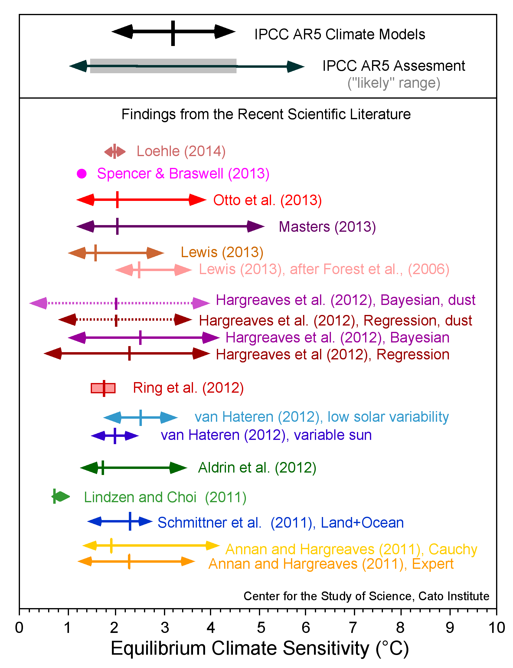 Figure 1. Climate sensitivity estimates from new research beginning in 2011 (colored), compared with the assessed range given in the Intergovernmental Panel on Climate Change (IPCC) Fifth Assessment Report (AR5) and the collection of climate models used in the IPCC AR5. The “likely” (greater than a 66% likelihood of occurrence)range in the IPCC Assessment is indicated by the gray bar. The arrows indicate the 5 to 95 percent confidence bounds for each estimate along with the best estimate (median of each probability density function; or the mean of multiple estimates; colored vertical line). Ring et al. (2012) present four estimates of the climate sensitivity and the red box encompasses those estimates. The right-hand side of the IPCC AR5 range is actually the 90% upper bound (the IPCC does not actually state the value for the upper 95 percent confidence bound of their estimate). Spencer and Braswell (2013) produce a single ECS value best-matched to ocean heat content observations and internal radiative forcing.[/caption]