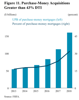 Despite the significance of DTI, the CFPB made Fannie and Freddie exempt from its post-crisis DTI limit, creating the loophole known as the “GSE patch” or “QM patch.” Since the patch came into effect five years ago, lenders have dished out high-DTI mortgages at a rising pace, safe in the knowledge that Fannie and Freddie — by now in government “conservatorship” — would buy them. Sure enough, the GSEs obliged, so that — as the chart below listing Fannie and Freddie mortgage acquisitions shows — an increasing share of the loans they buy from lenders have been high-DTI loans.
