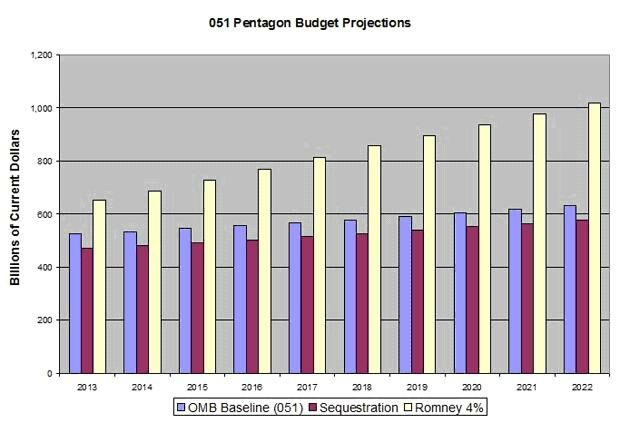 In my first analysis, his plan totaled $2.046 trillion above projected defense budgets based on CBO totals from FY 2012 to FY 2021. That total does not include war costs, nor does it take into account the possibility of military action toward Iran, which Romney has made clear is on the table, with or without Congressional approval. My number one question at the time—beyond the fact that GDP is not the proper guide for military spending—was: Where is this money going to come from?