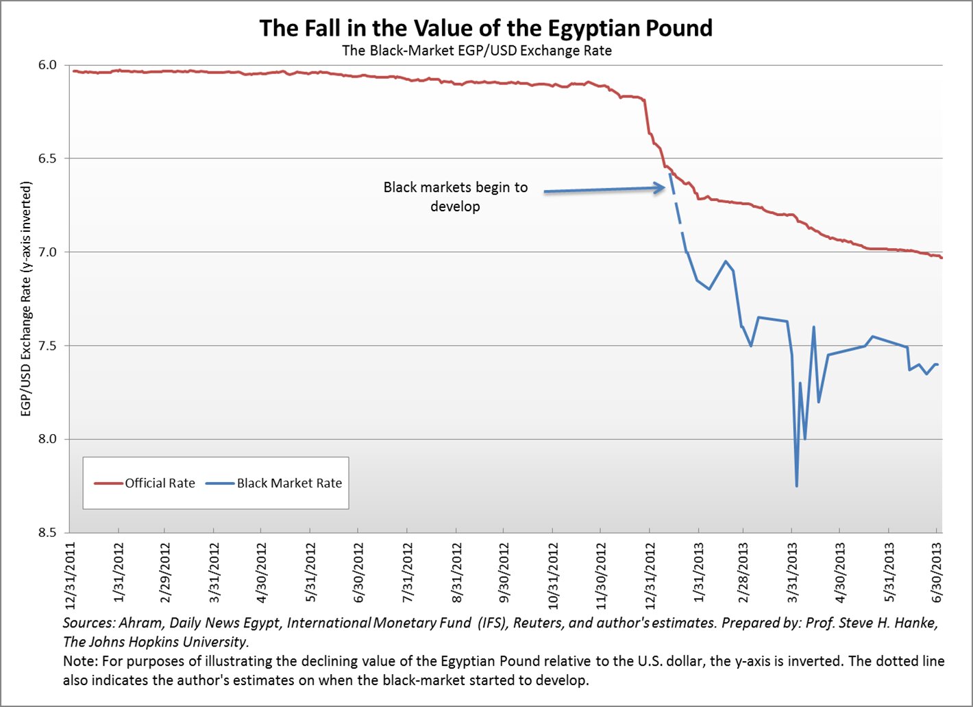 Yes, as the accompanying charts illustrate, the story of a failing Egyptian economy is the story of a troubled Egyptian pound – and of the inflation troubles that accompanied it. Indeed, as of July 1, 2013 (shortly before before Morsi’s ouster), Egypt’s annual inflation rate was 27.1 percent.
