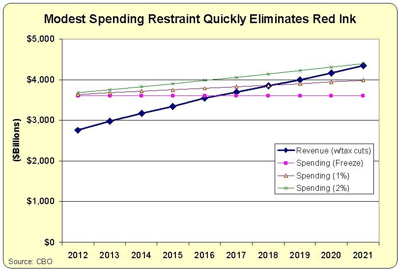 Even if we assume that the 2001 and 2003 tax cuts are made permanent, all that is needed is for politicians to put government on a modest diet so that overall spending grows by about two percent each year. In other words, make sure the budget doesn’t grow faster than inflation.