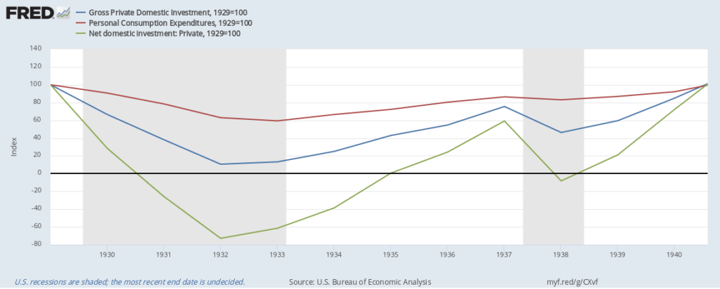 Practically everyone agrees that inadequate investment held back the recovery. A glance at the chart below, showing percentage changes in net and gross private investment and consumption spending since the start of 1929, should suffice to drive home just how little investment there was.