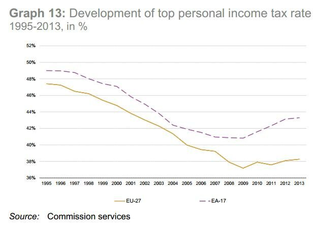So how have they responded since that time? Well, look at this chart from the European Union’s new report on taxation trends. Tax rates have begun to increase, reversing a very positive trend (which began with the Reagan and Thatcher tax cuts, though this chart only shows data since 1995).