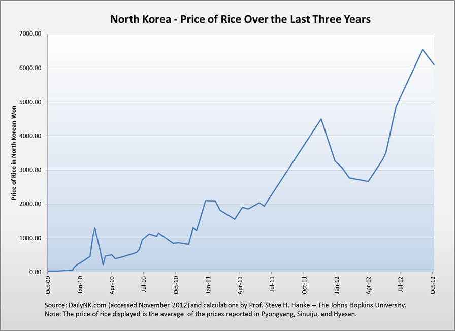 From what little data are available, it would appear that, in the span of six months, the price of rice has increased by nearly 130%. This is par for the course in North Korea, where the price of rice has increased by roughly 28,500% over the last three years (see the chart below).