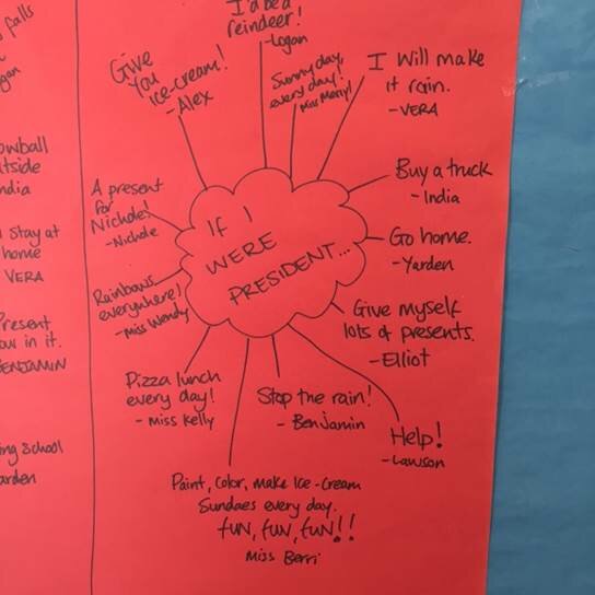 Recently a friend of mine sent me a picture of a diagram she saw at her son’s pre-school, created around Presidents’ Day. It shows what the students (3 year-olds) would do if they were president.