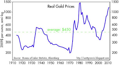 While the general thrust of Mr. Porter’s essay is that one has to be daft to say nice things about the gold standard, he is generous enough to allow that this might not be the only reason for Ron Paul’s defense of gold. After all, Porter informs us, “much of his [Paul’s] wealth is tied up in gold-mining stocks.” Consequently, Porter reasons, Paul “would certainly benefit if even more American’s caught the gold bug.” But would he? Have a look at any plot of the real price of gold, and ask yourself whether, if you had “much of your wealth” in gold mining, you would be pleading for a return to the gold standard, or pulling hard for a continuation of the fiat-money status quo. Besides not making sense, and being nasty, Porter’s argumentum ad hominem is profoundly silly. Would he have us conclude that Paul is pro-life only because he’s a pediatrician an obstetrician, or that, since he favors drug legalization, he must be long on marijuana, coca, and poppies?