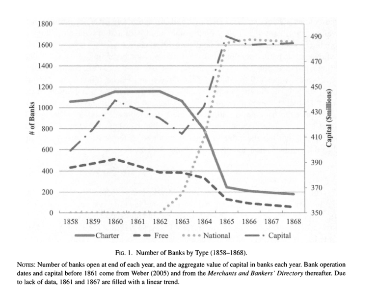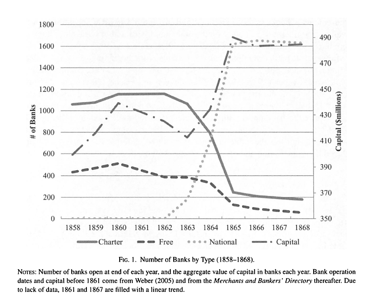 The OCC says that, in taxing the notes of state banks, the federal government was “signaling its determination that national banks would triumph and the state banks would fade away.” But that “fade away” is so much sugar-coating: deprived of their ability to issue currency, state banks dropped like flies. Although they were granted a stay of execution by a law delaying the implementation of the tax until August 1866, by the end of the decade only 250 state banks were left. Nor was their demise a reflection of the public’s belated discovery of their notes’ inferiority. According to Jaremski (p. 386), who has studied the matter closely, the 10 percent tax “seems to have been the only piece of legislation capable of closing state banks” (my emphasis).