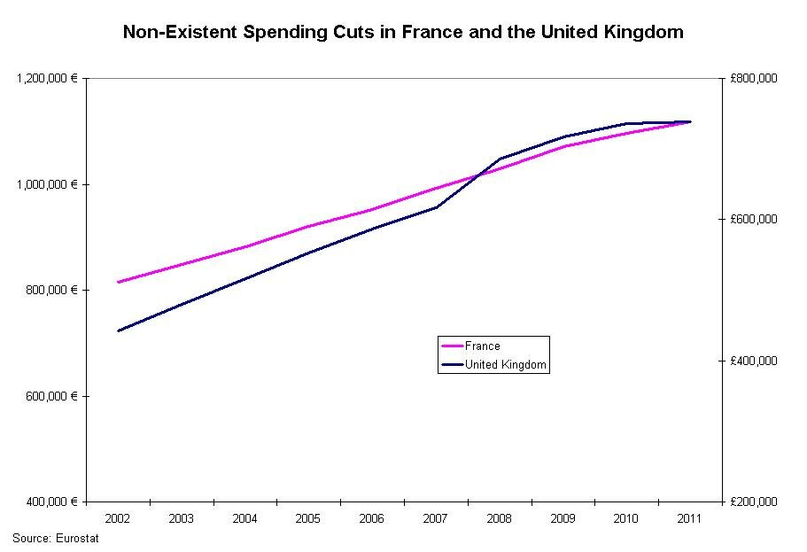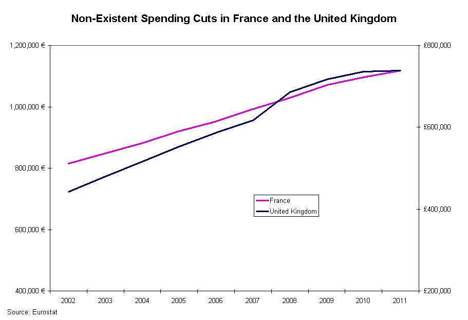 So let’s take a look at the actual data and see how much “slashing” has been implemented in France and the United Kingdom. Here’s a chart with the latest data from the European Union.