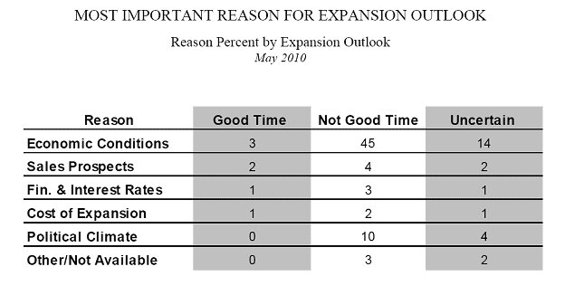 Considering the depth and length of the recession, the fact that “economic condition” is the runaway leader isn’t surprising. But I wonder how many of the businesses citing “economic conditions” are happy with the “political climate.” I doubt very many. Notice that zero respondents said that the political climate was a “good time” to expand. Couple that with the plurality who said this isn’t a good time to expand due to economic conditions and you get an indictment of the administration’s interventionist policies that Krugman has supported.