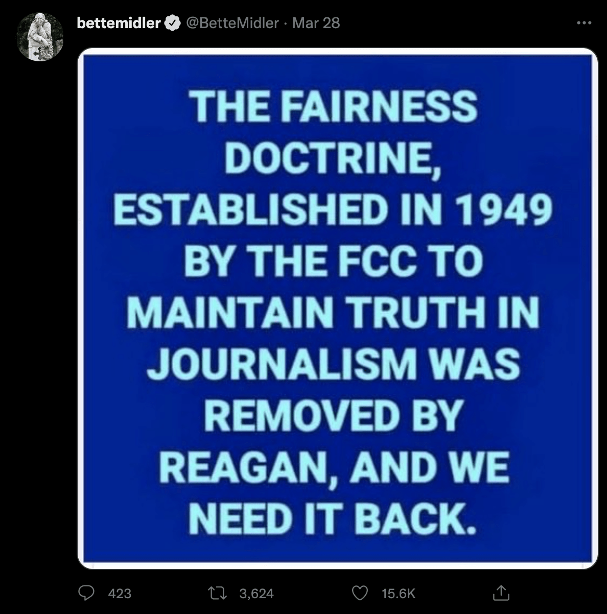 As I’ve written elsewhere, the Fairness Doctrine was responsible for one of the most successful episodes of government censorship in US history. The Kennedy, Johnson, and Nixon administrations each weaponized the rules to punish their political opponents, especially those in conservative radio broadcasting. However, the image Midler shared is particularly notable in both the ways that it is incorrect and what that says about growing public openness to government regulation of media.